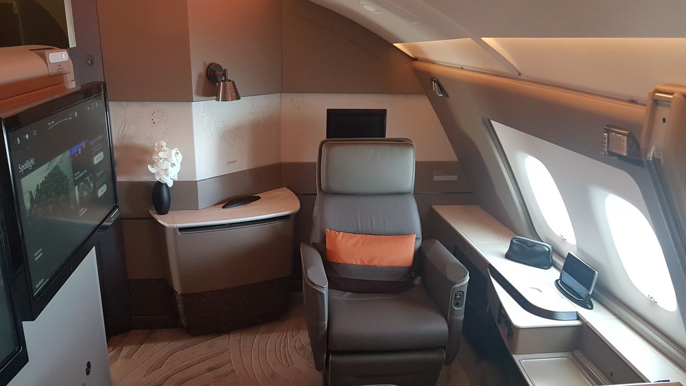 There is a massive 32 inch HD video panel, electronically-controlled roller blinds (to turn your suite into a cosy cocoon) an under-bench area to stow your carry-on bag and a personal wardrobe.