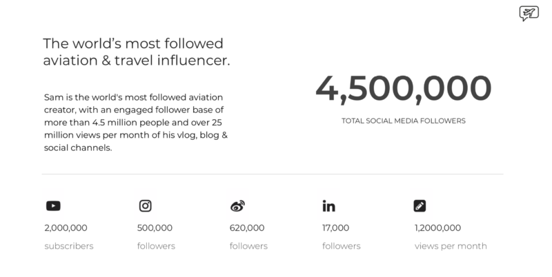 Sam Chui is one of the most followed aviation creator on the internet, with an engaged follower base of more than 4.5 million people and over 25 million views per month on his content across his vlog, blog and social channels.