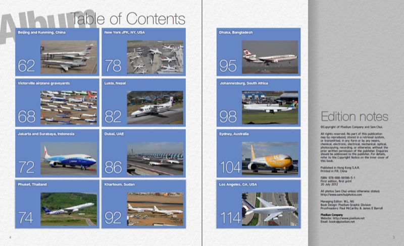 Air2 – Aviation Photos and Flight Reports by Sam Chui SOLD OUT 16 Unique Trip Experiences 12 Aviation Photo Galleries 140 full color pages About this book Publisher: Pixelium Company, Hong Kong ISBN: 978-988-99186-5-1 Number of Pages: 140 Size and Binding: 210 mm width × 257 mm height; Softback SOLD OUT Our authorized resellers worldwide Look inside