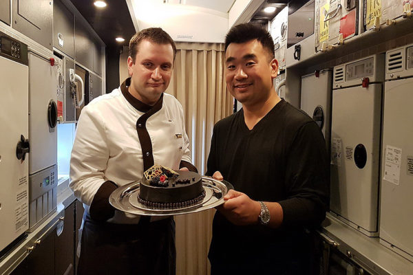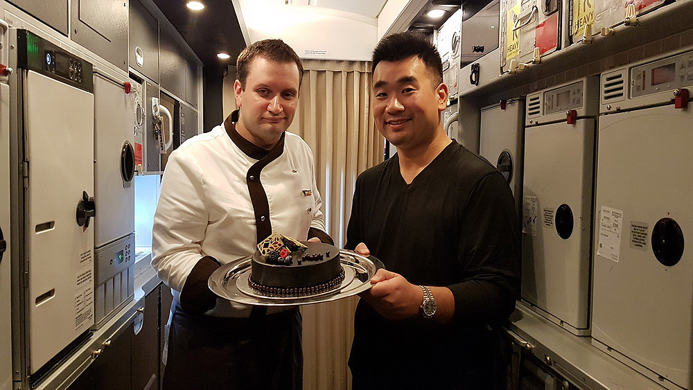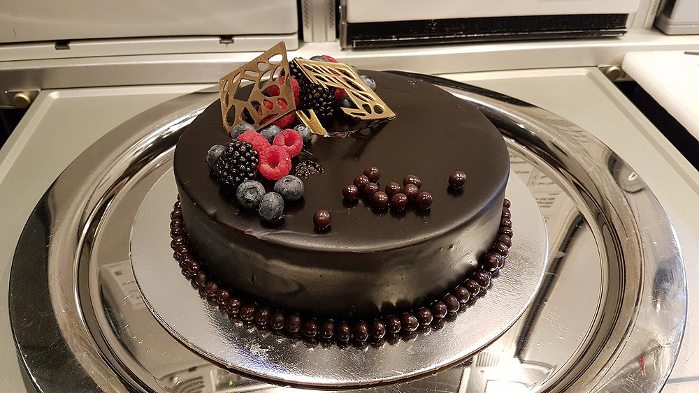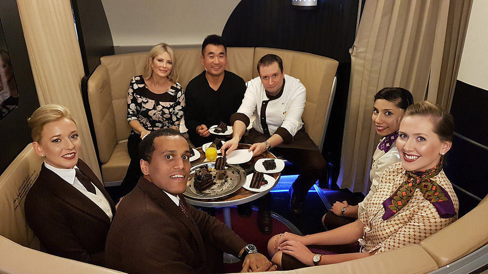 After take-off at 2:30am, it is time to hit the bed quickly but Leanne suggested to try out some Masala Chai (Tea) and we have a celebration cake as dessert before going to sleep. The cake was huge and very rich chocolate. I invited other crew and passengers to join me in "The Lobby" lounge area on the A380.
