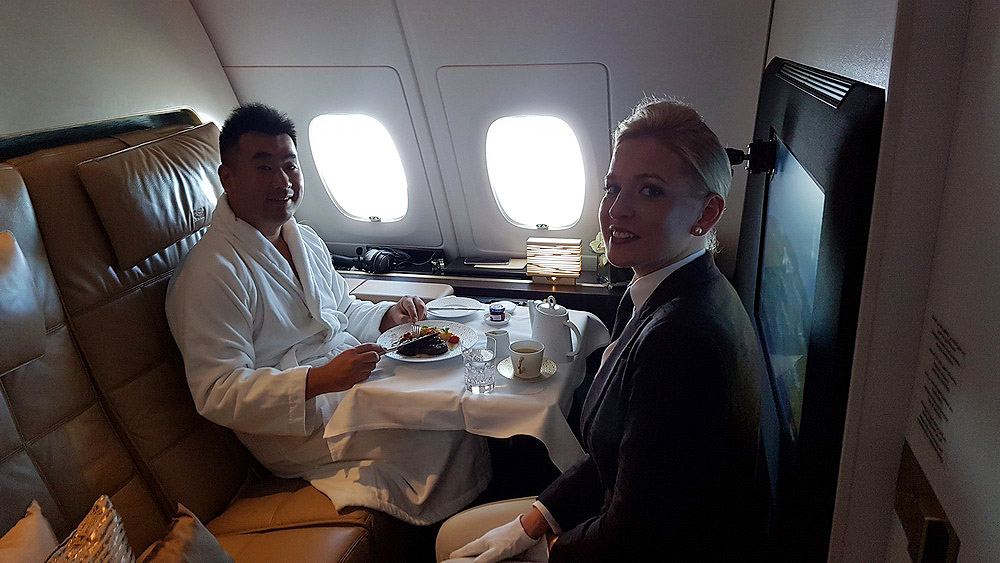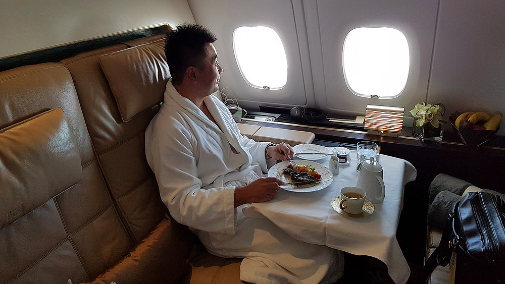 I have my breakfast (Caviar!!) in bed while watching the A380 tail camera in the sky but chose to dine in the lounge area on the 2nd course (steak and eggs) while wearing the bathrobe. The privacy is excellent in the Residence that you simply do not feel like sharing with any other passengers on the same plane!