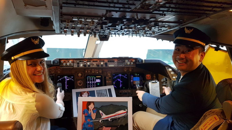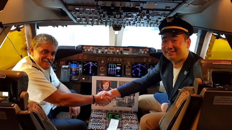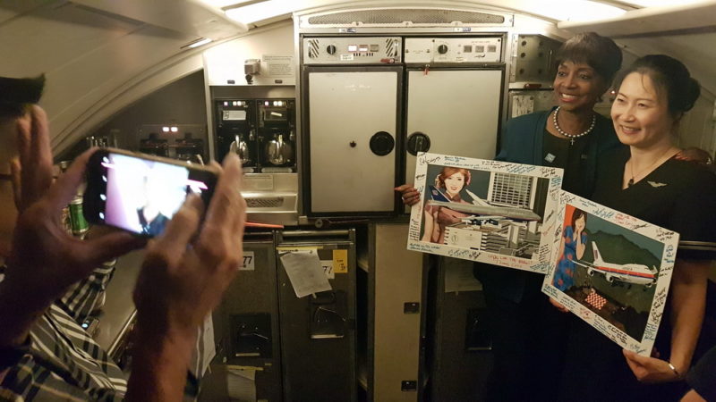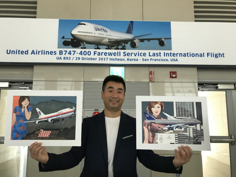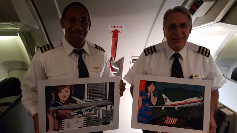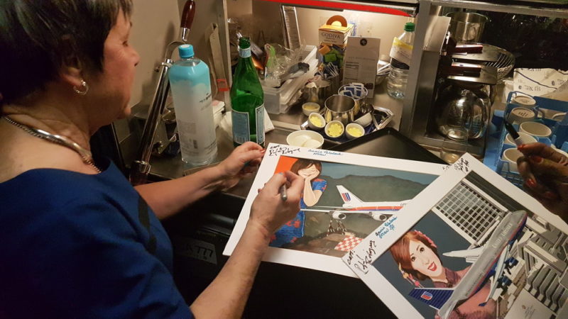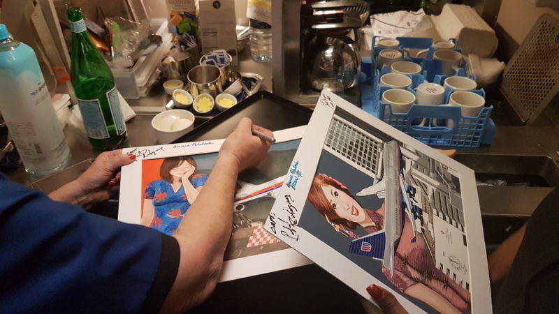 I brought 2 of my beloved “United B747 landing in Kai Tak” paintings from my collection and had the crew sign the frames (Painting by Dutch artist Mario Van Eeren)