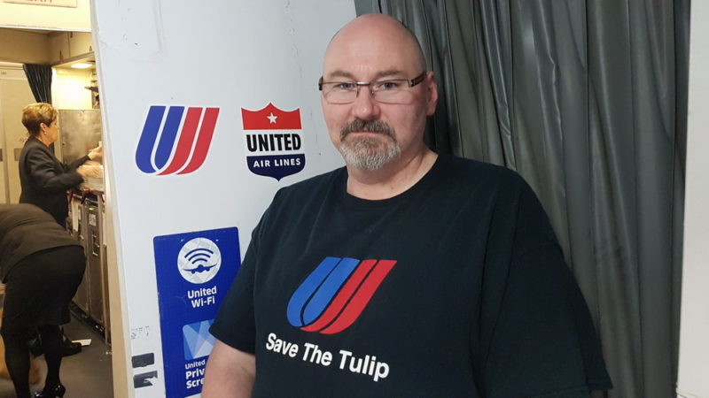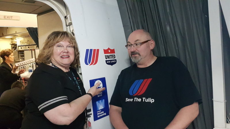Boarding took longer than usual, due to many AvGeek and United Air Line fans took the opportunity to take 1 last photo. One United Tulip big fan, Mark, brought hundreds of United Tulip stickers and decided to stick them on the door and on many parts inside the aircraft! "Bring back the Tulip" he said.