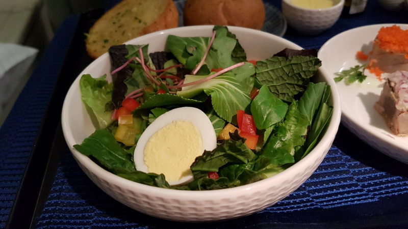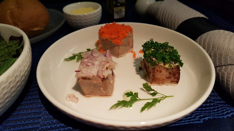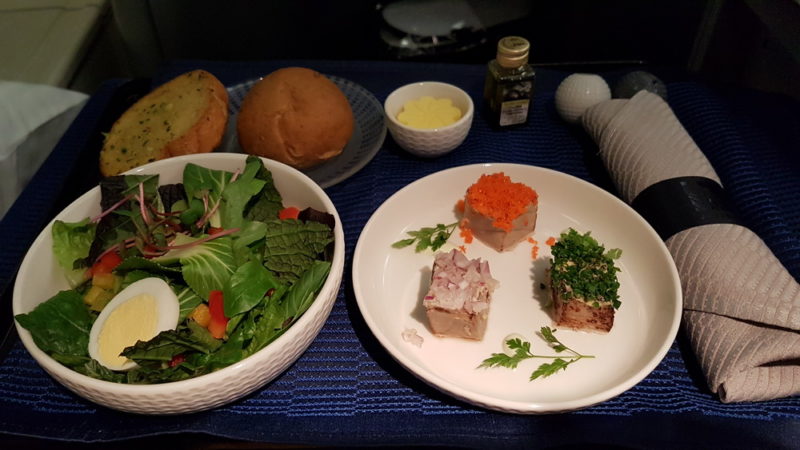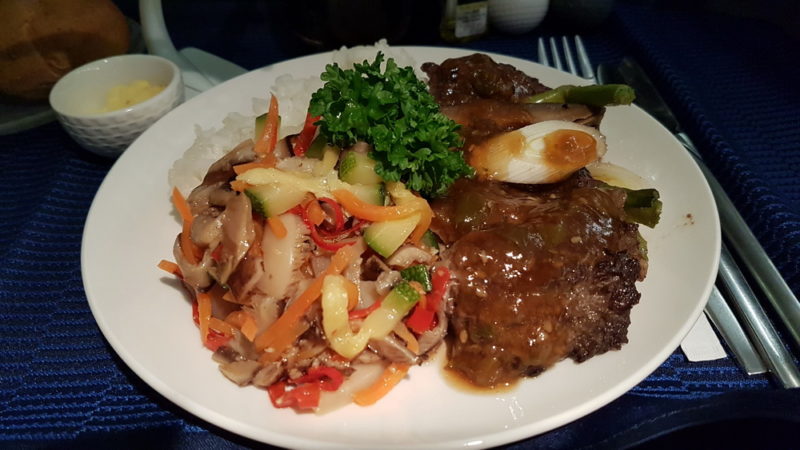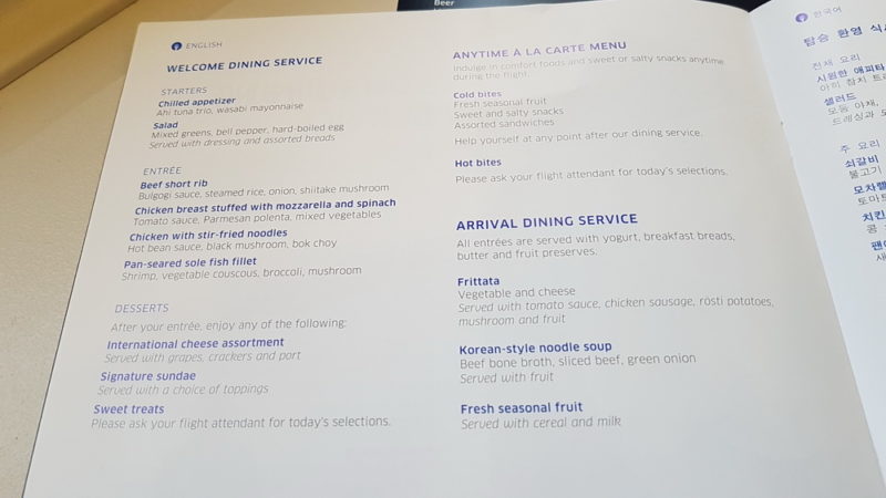 Service started after take-off, with first a wine tasting the followed by dinner. The starter was a trio of Tuna Ahi; I had the Korean Bulgogi Beef as my main course.