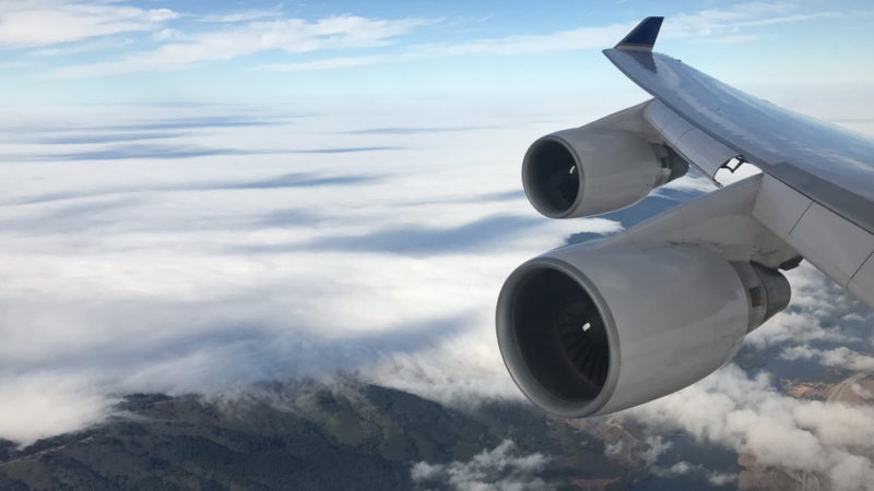 We were on the final descent into San Francisco around 10:45am; the bay area was covered by a low morning fog (marine layer).
